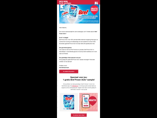 An e-CRM Journey Acquistion increases engagement of the customer by sending one e-mail and a reminder afterwards of only one advertiser. You can define your own target audience and choose from several available templates for the e-mail. You can highlight an existing promotion or content inspiration with a possibility to link to a voucher or e-deal. The reminder can be sent by e-mail or via Push Notification.