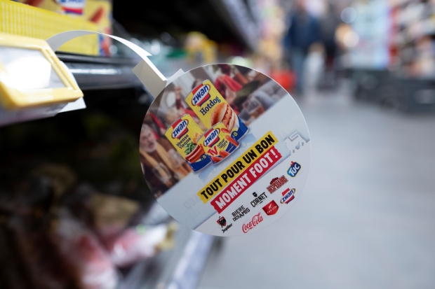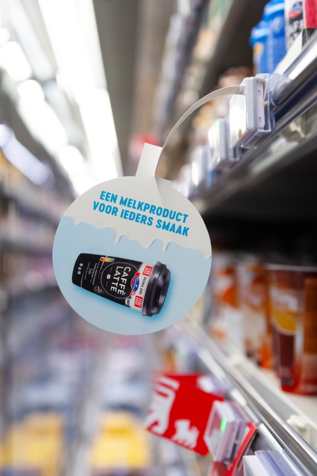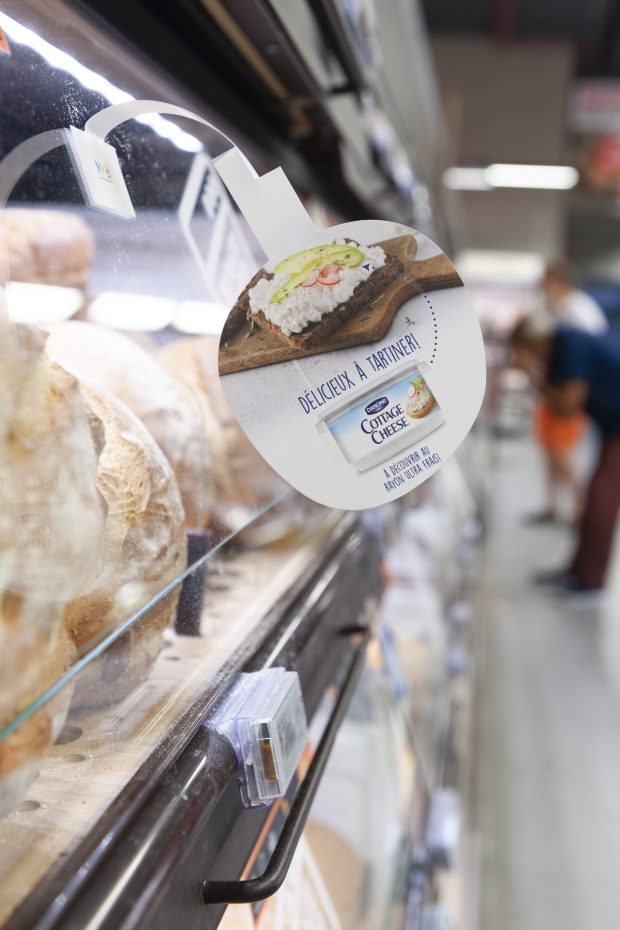 A wobbler is a dynamic strip hung on the shelf with a possibility to place it outside the category to enable cross-communication (i.e.: fresh cheese in the fish category).