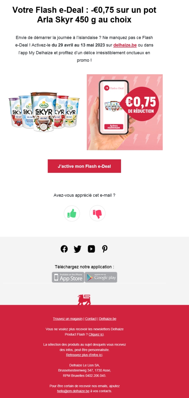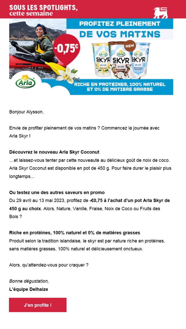 Beginning 2023, Arla Skyr introduced a new flavour in its Skyr range of 450gr pots, Coconut. In order to support this new flavour, and as a complement to its 360° campaign (online bannering, social media, sponsoring of Urban Walk Brussels/Bruges and instore communication), MMD proposed a personalised communication strategy, combining a A5 postcard with a dedicated e-mail.